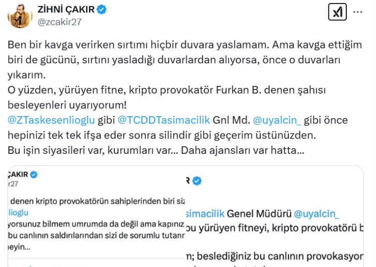 O yüzden, yürüyen fitne, kripto provokatör Furkan B. denen şahısı besleyenleri uyarıyorum! @ZTaskesenlioglu gibi @TCDDTasimacilik Gnl Md. @uyalcin_ gibi önce hepinizi tek tek ifşa eder sonra silindir gibi geçerim üstünüzden. Bu işin siyasileri var, kurumları var… Daha ajansları var hatta…”