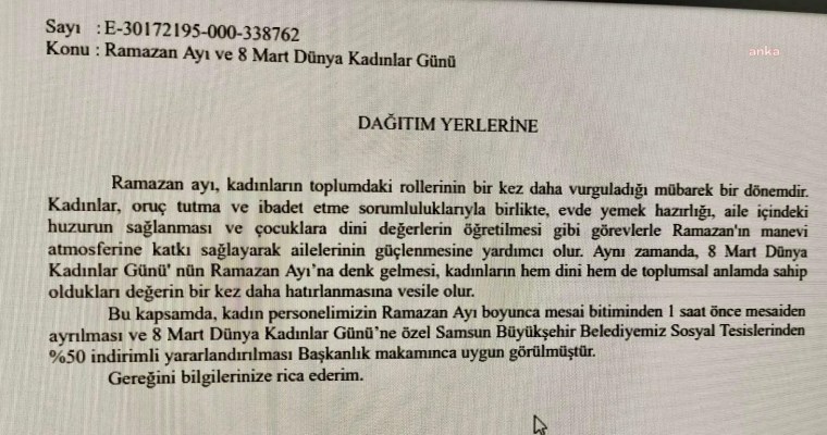”Elimizde şu anda Samsun Büyükşehir Belediyesi genel sekreterinin belediyedeki birim amirlerine gönderdiği bir iç yazışma metni var. İç yazışma metni ‘Ramazan ayı ve 8 Mart Dünya Kadınlar Günü’ başlığıyla başlıyor. Bu yazıda genel sekreter, kadınlara rollerini hatırlatıyor. Diyor ki ‘Öncelikli olarak ibadetlerinizi yapın. Oruç tutma ve ibadet etmek sizin sorumluluğunuz’. Size diyor ‘akşam bir saat erken izin veriyoruz, evinize bir saat erken gidebilirsiniz.
