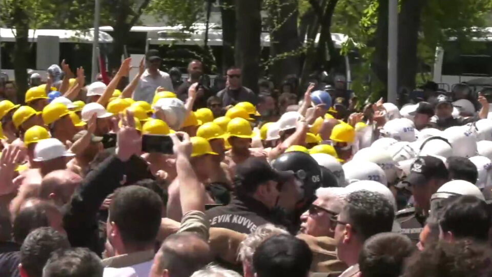 Milletvekillerinin de destek olduğu işçiler, Bakanlığa yürümek için polis barikatlarına yüklendi.