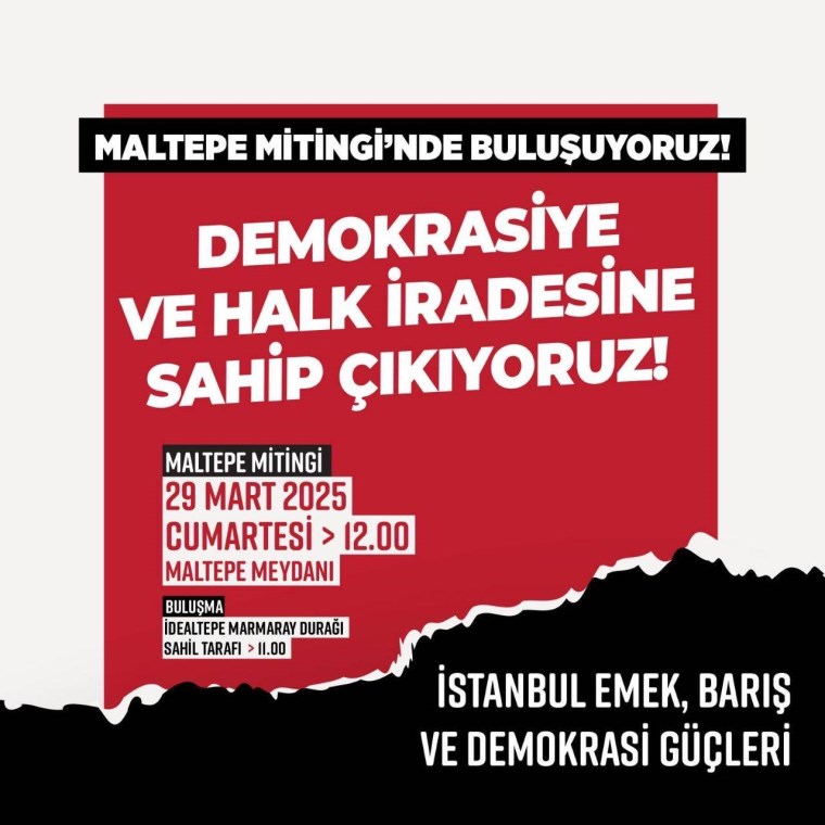 Açıklamada, “İstanbul Emek, Barış ve Demokrasi Güçleri olarak 29 Mart Cumartesi günü saat 12:00’de Maltepe Mitinginde buluşuyoruz. Demokrasiye ve halk iradesine sahip çıkıyoruz!” denildi.