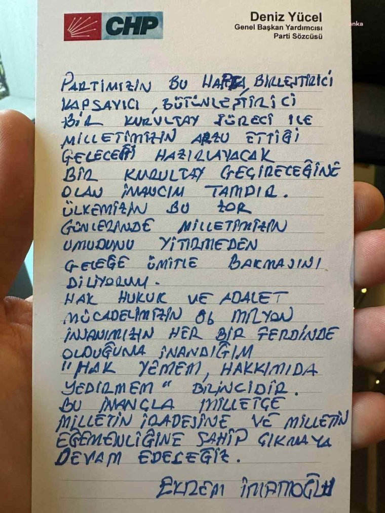 Deniz Yücel, CHP’nin Cumhurbaşkanı adayı Ekrem İmamoğlu’nun görüşmede kendisine ilettiği 6 Nusan Pazar günü yapılacak kurultuya yönelik mesajını da paylaştı.