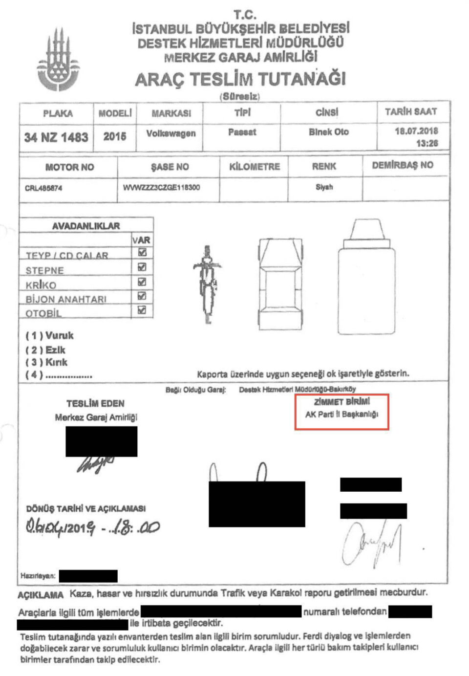 Yavuzyılmaz’ın paylaştığı ve İstanbul Büyükşehir Belediyesi Destek Hizmetleri Müdürlüğü Merkez Garaj Amirliği tarafından düzenlendiği görülen “Araç Teslim Tutanağı” başlıklı belgede, 2015 model Volkswagen Passat marka bir aracın “zimmet birimi” bölümünde “AK Parti İl Başkanlığı” ifadesinin yer aldığı görüldü.