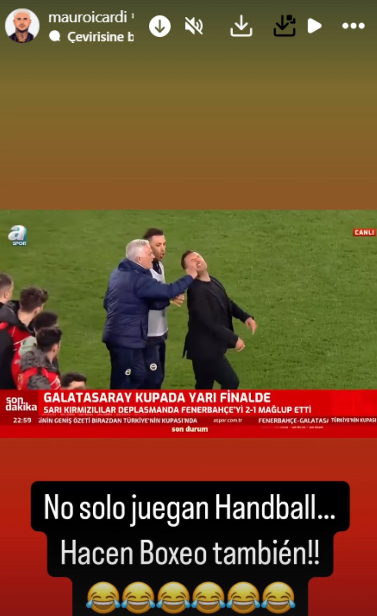 Icardi paylaşımında, Mourinho’nun Okan Buruk’un burnunu sıktığı görüntünün üzerine, “Sadece hentbol oynamıyorlar, boks da yapıyorlar” ifadelerini kullandı.