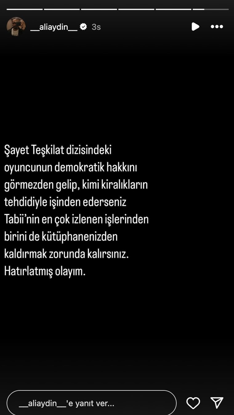 “Şayet Teşkilat dizisindeki oyuncunun demokratik hakkını görmezden gelip, kimi kiralıların tehdidiyle işinden ederseniz Tabii’nin en çok izlenen işlerinden birini de kütüphanenizden kaldırmak zorunda kalırsınız. Hatırlatmış olayım.”