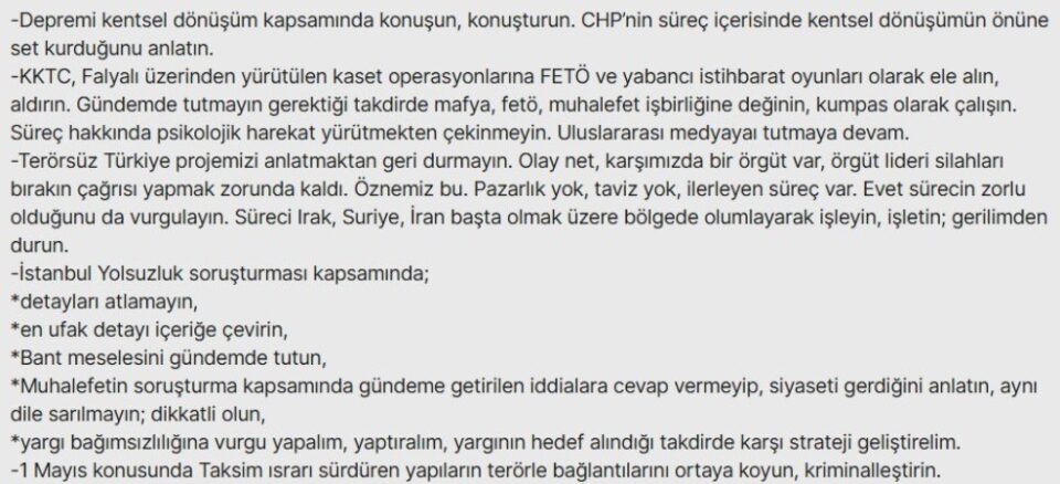Cumhuriyet Halk Partisi Genel Başkanı Özgür Özel, Başakşehir’de partisinin yaptığı mitingteki konuşmasında “Bugün AK Parti’nin, daha doğrusu Cumhurbaşkanlığı’nın İletişim Başkanlığı AK Parti’nin milletvekillerine televizyonda konuşacakları not yollamış. Diyor ki ‘İBB soruşturmasında savcılığın iddialarını bol bol söyleyin, Cumhuriyet Halk Partisi’nin verdiği cevapları duymazdan gelin. Cevap vermeyin, sakın ha büyütmeyin.’ Not yazmış, ‘KKTC, Halil Falyalı konusunda mümkünse konuya hiç girmeyin. Konu açılırsa FETÖ ve yabancı istihbaratın oyunu olarak değerlendirin. Sakın ha sakın CHP’nin Kıbrıs iddialarına cevap vermeyin. 1 Mayıs’ta Taksim’e gitmek isteyenlerin terör bağlantılı marjinal gruplar olduğunu söyleyin. Bu konuda eskilerden soran olursa sakın cevap vermeyin.’ Bu nedir biliyor musunuz? Bu nedir? Bu şudur. Adalet ve Kalkınma Partisi ahlaki üstünlüğü kaybetmiş, psikolojik üstünlüğü kaybetmiş, kendi zihninde muhalefete düşmüş, Cumhuriyet Halk Partisi’nden ve bu meydandan korkuyor, milletvekillerine nasıl savunma yapacağını anlatıyor. Korkun bizden, biz haklıyız, biz güçlüyüz, biz kazanacağız” ifadelerini kullanmıştı.