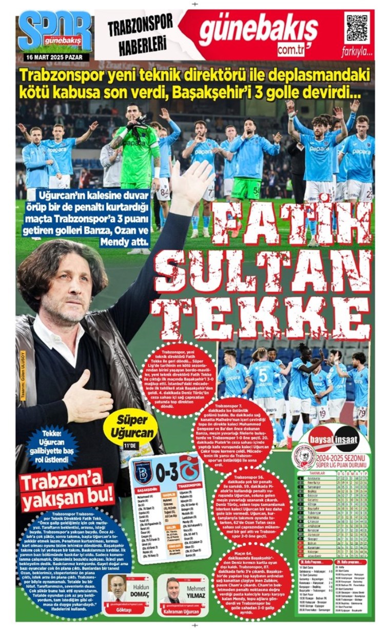 Öte yandan Trabzon’da yayın yapan yerel gazeteler de bordo-mavili takımın Başakşehir deplasmanında aldığı galibiyeti yeni hocası Fatih Tekke’yi manşetlerine çekerek kullandı.