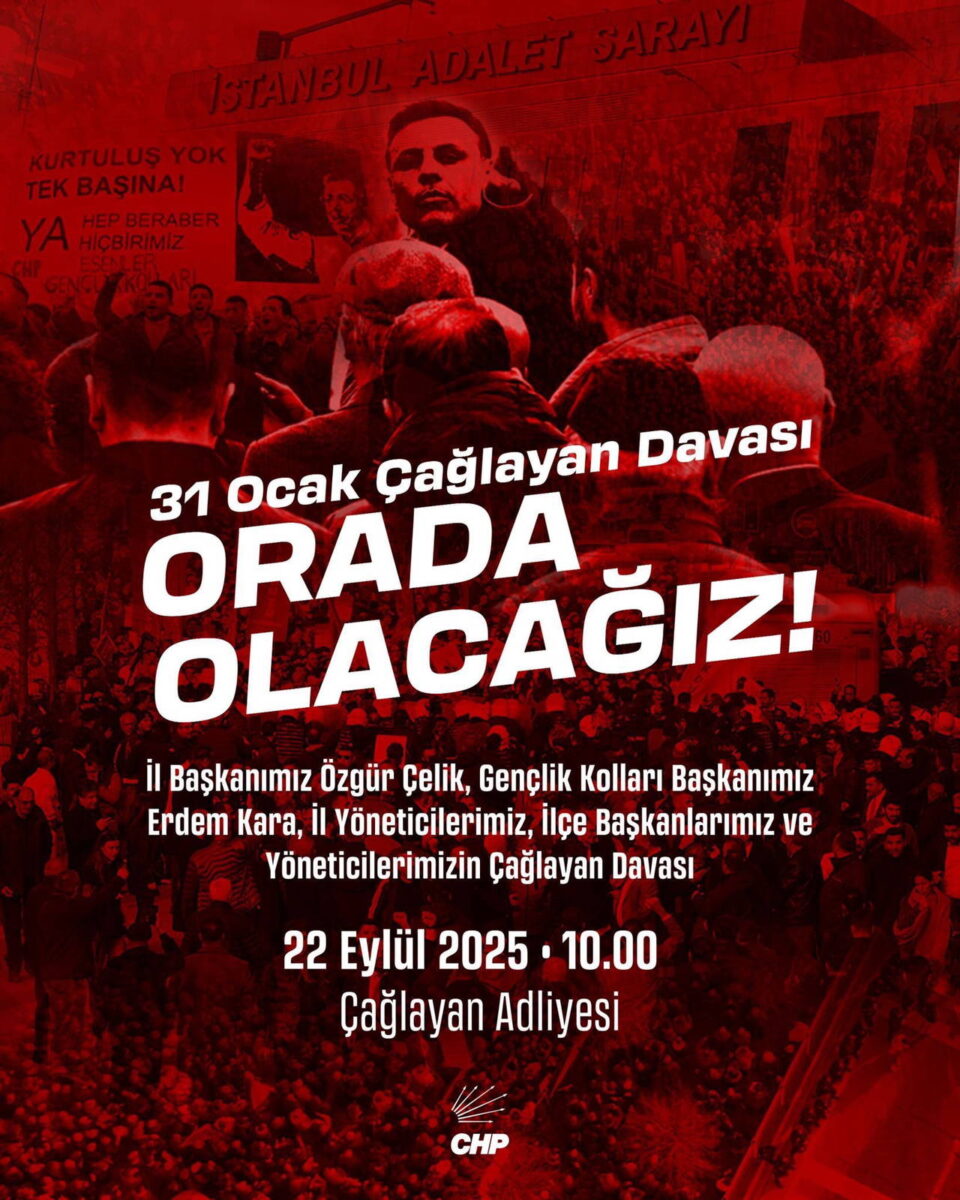 CHP İstanbul İl Örgütü, il yöneticileri, ilçe başkanları ve gençlik kolları yöneticileri davaya topluca katılım çağrısı yaptı. Parti örgütü, “31 Ocak Çağlayan Davası’nda orada olacağız” mesajıyla Çağlayan Adliyesi önünde bir araya gelecek.